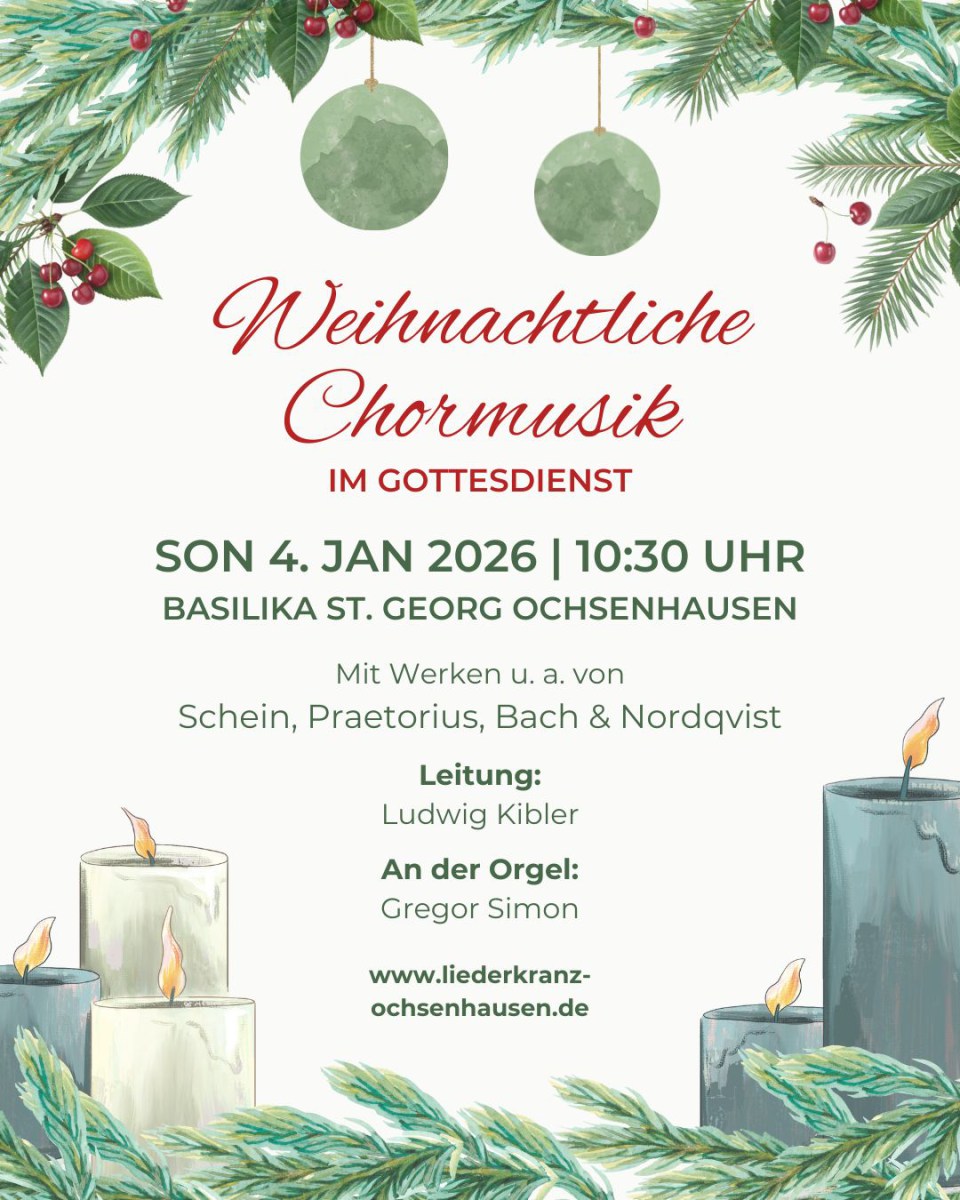 Mit festlichen Klängen und stimmungsvoller Atmosphäre lassen wir unser Weihnachtsprojekt ausklingen. Am Sonntag, 4. Januar, gestalten wir gemeinsam mit unserem Chorleiter Ludwig Kibler den Gottesdienst um 10:30 Uhr in der Basilika St. Georg in Ochsenhausen mit Weihnachtsmusik – besinnlich, feierlich, traditionell und schwungvoll. An den Orgeln der Basilika begleitet uns Gregor Simon und lässt den Kirchenraum klangvoll erstrahlen.